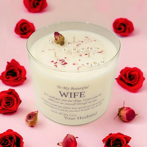 Introducing our "Lover's Lullaby" scented candle - a delicate blend of rose 🌹 petals and warm lavender that creates an ambiance of intimate, romantic tranquility. As you light this candle, let the soft flickering flame accompany the heartfelt 💖message inscribed on the glass jar.
